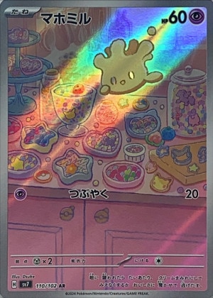 アップルパイなどの焼き菓子と共に描かれた、絵本のような温かみのあるタッチが特徴です。「サナ」や「モミ」など数々の人気カードを生み出した同氏の作品であり、対戦需要とは異なる純粋なコレクション需要によって支えられています。